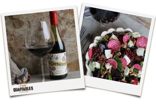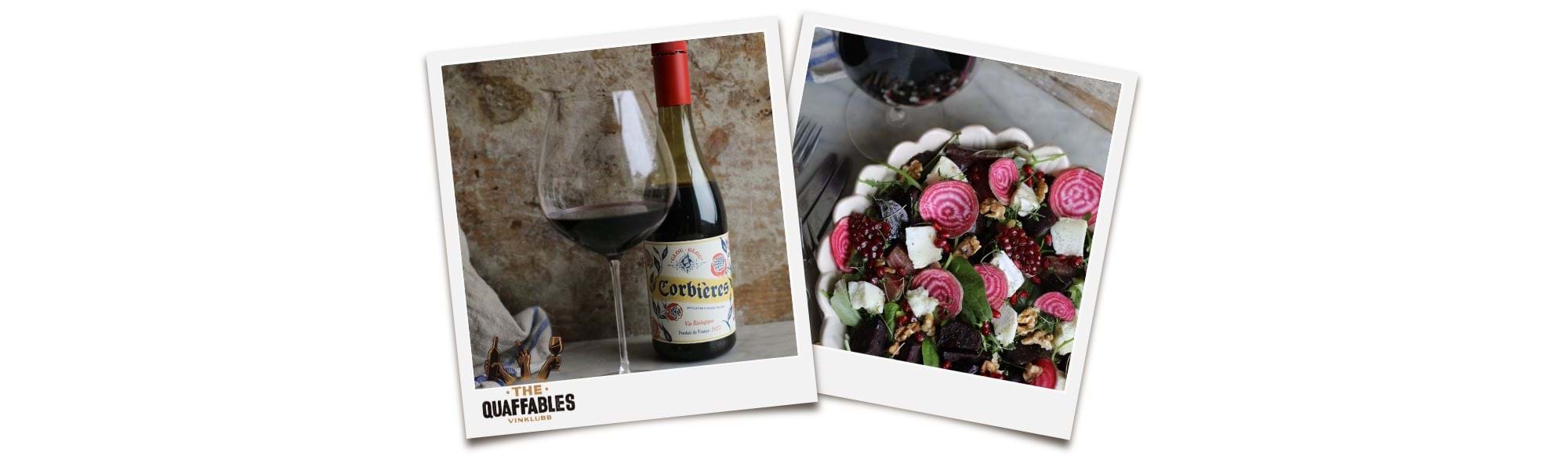 Här delar vi med oss av ett recept på sallad med betor, chèvre, granatäpple och valnötter. I glaset Glou-Glou Corbières – ett charmigt, ekologiskt rödvin från södra Frankrike.